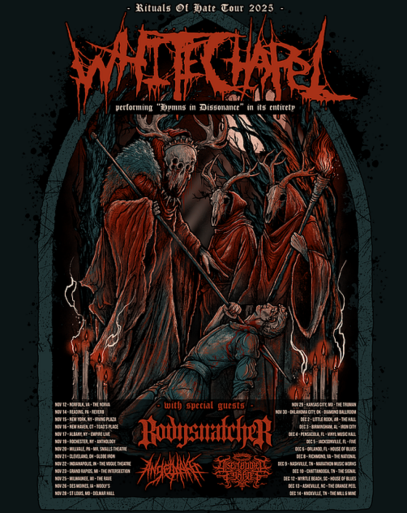 Rituals Of Hate tour, makes its way through over two dozen cities from November 12th through December 14th and will see the band perform Hymns In Dissonance in its devastating entirety alongside some old favorites. Support will be provided by Bodysnatcher, Angelmaker, and Disembodied Tyrant. Find tickets and VIP upgrades at: www.whitechapel.soundrink.com